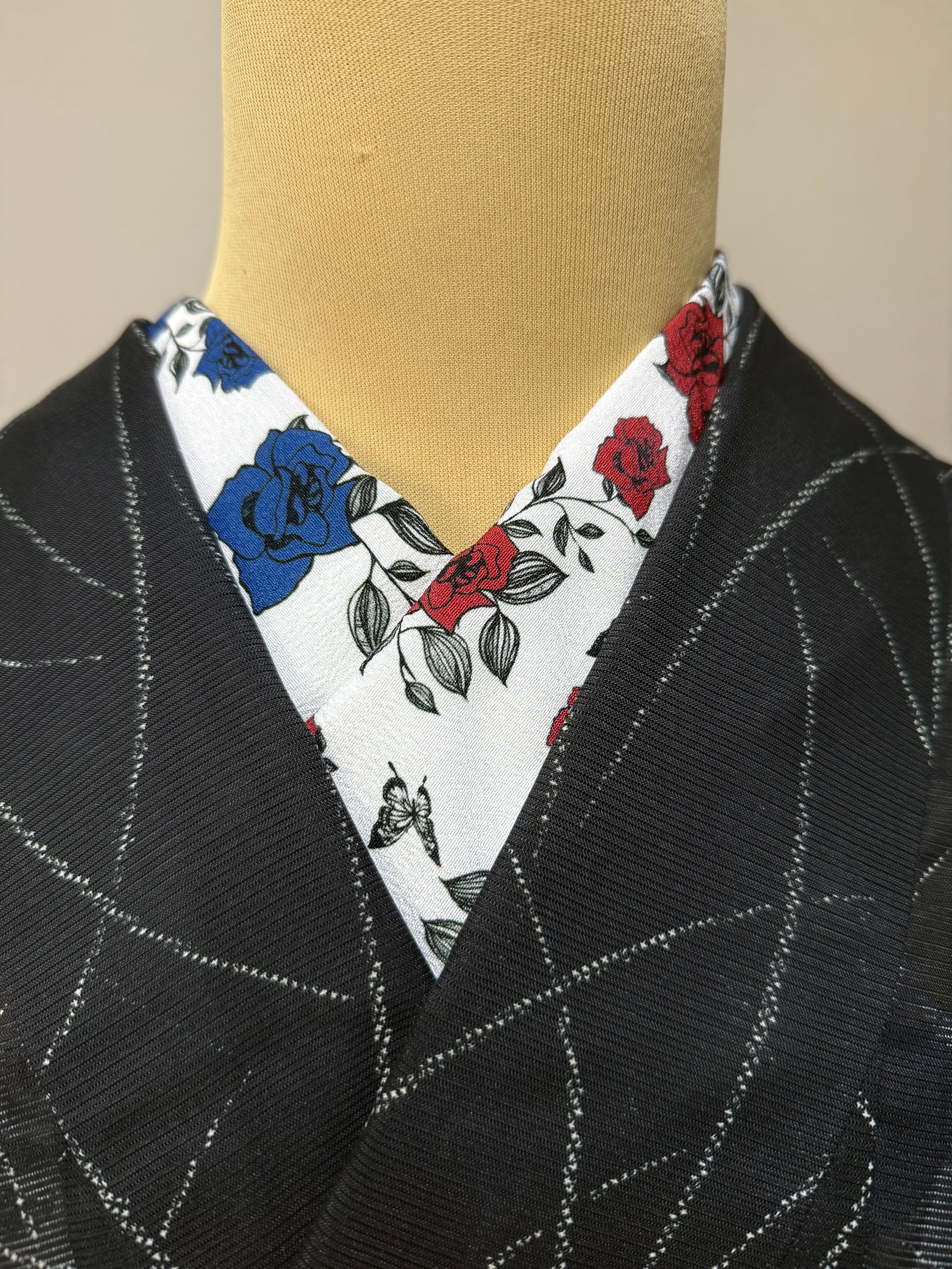 こちらの半衿 は、薔薇柄は赤と青のアシンメトリーで1枚で2通り楽しめるデザインです。