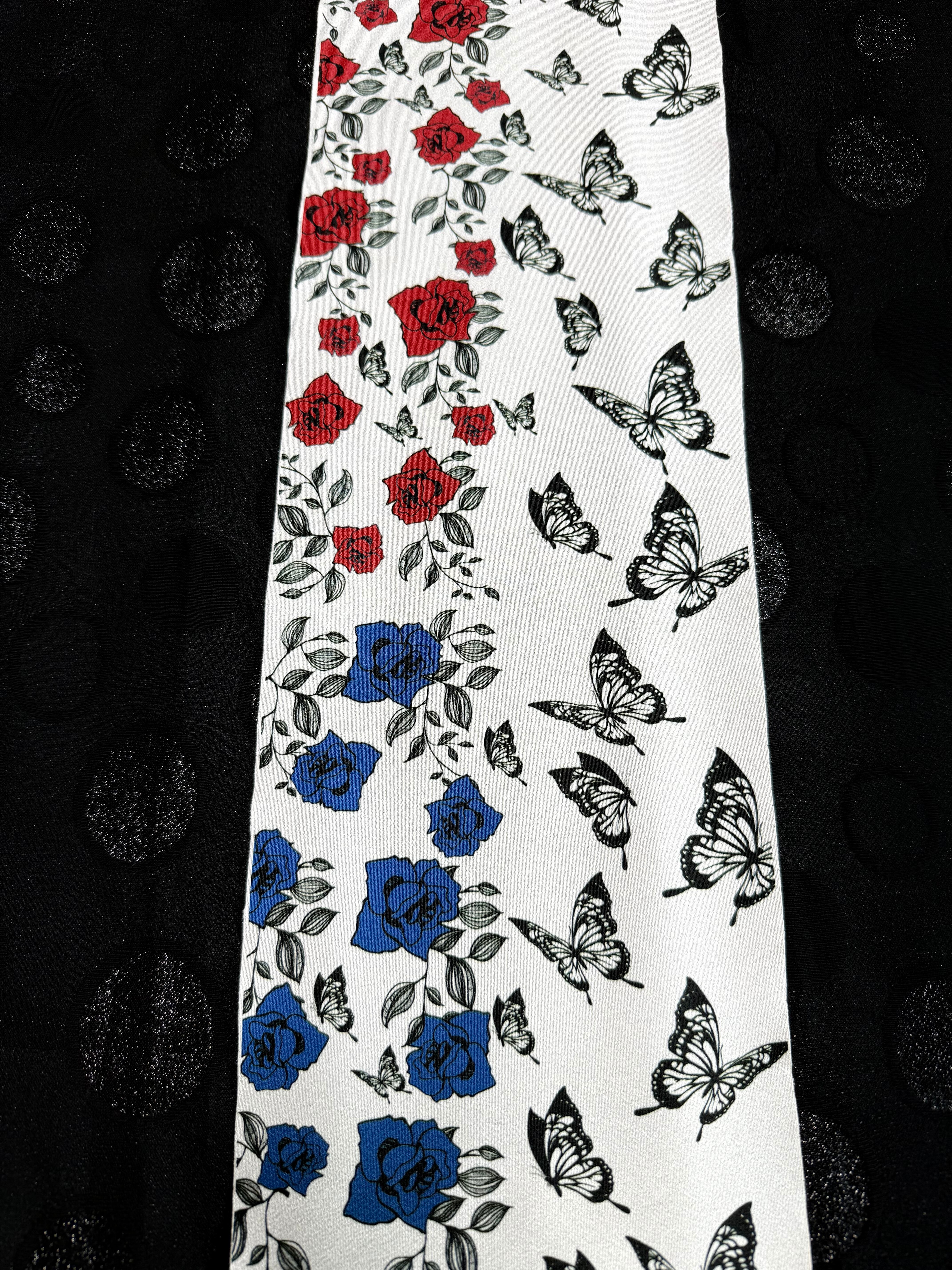 「赤薔薇x青薔薇」で使ったり「蝶柄」で使ったり、その日の気分や着る着物に合わせてコーディネートを自由に楽しむことができるのが嬉しいポイントです。
