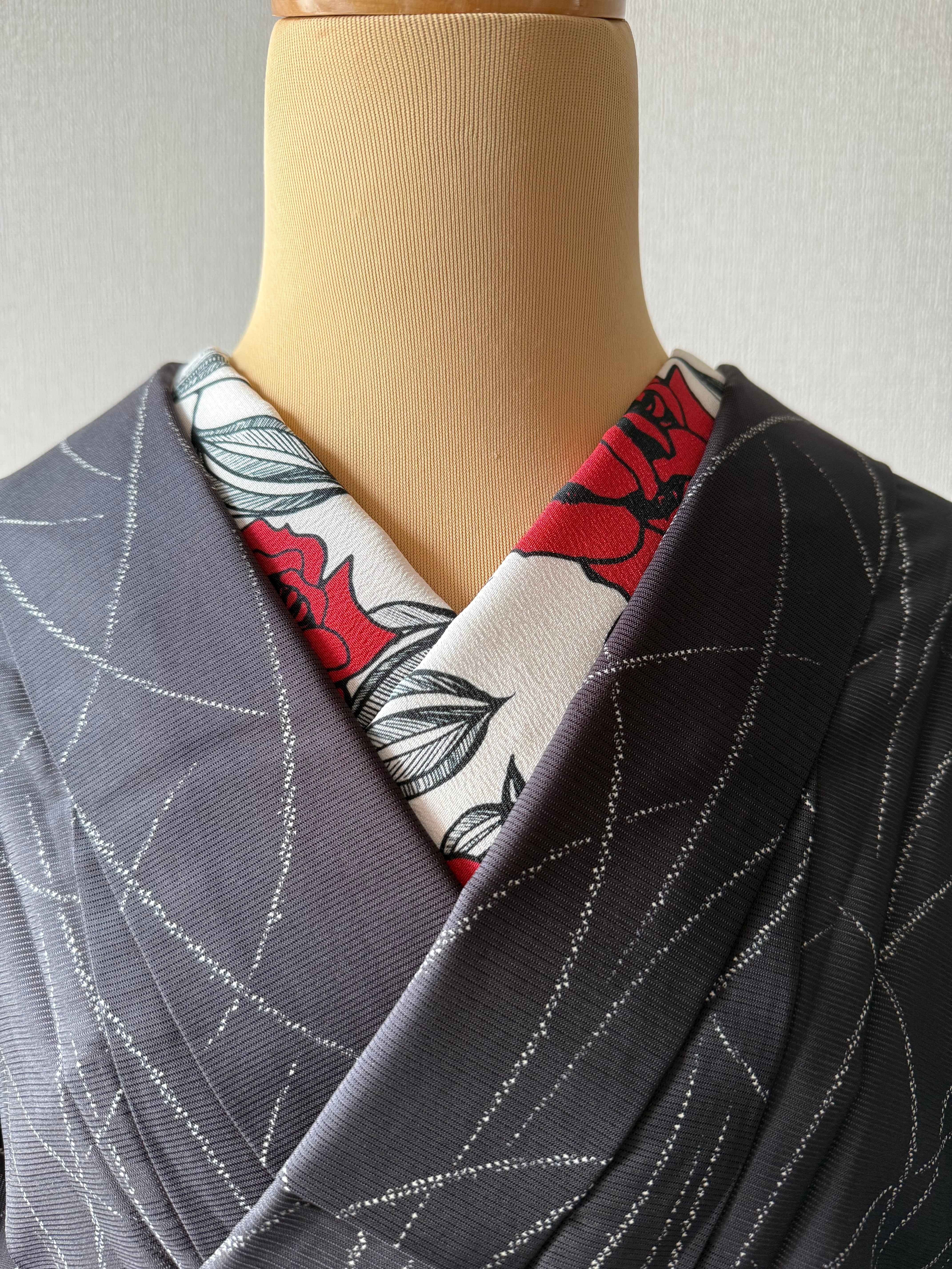 こちらの半衿は、線で描いた葉っぱが大きな薔薇を引き立てる、非常に魅力的なデザインです。