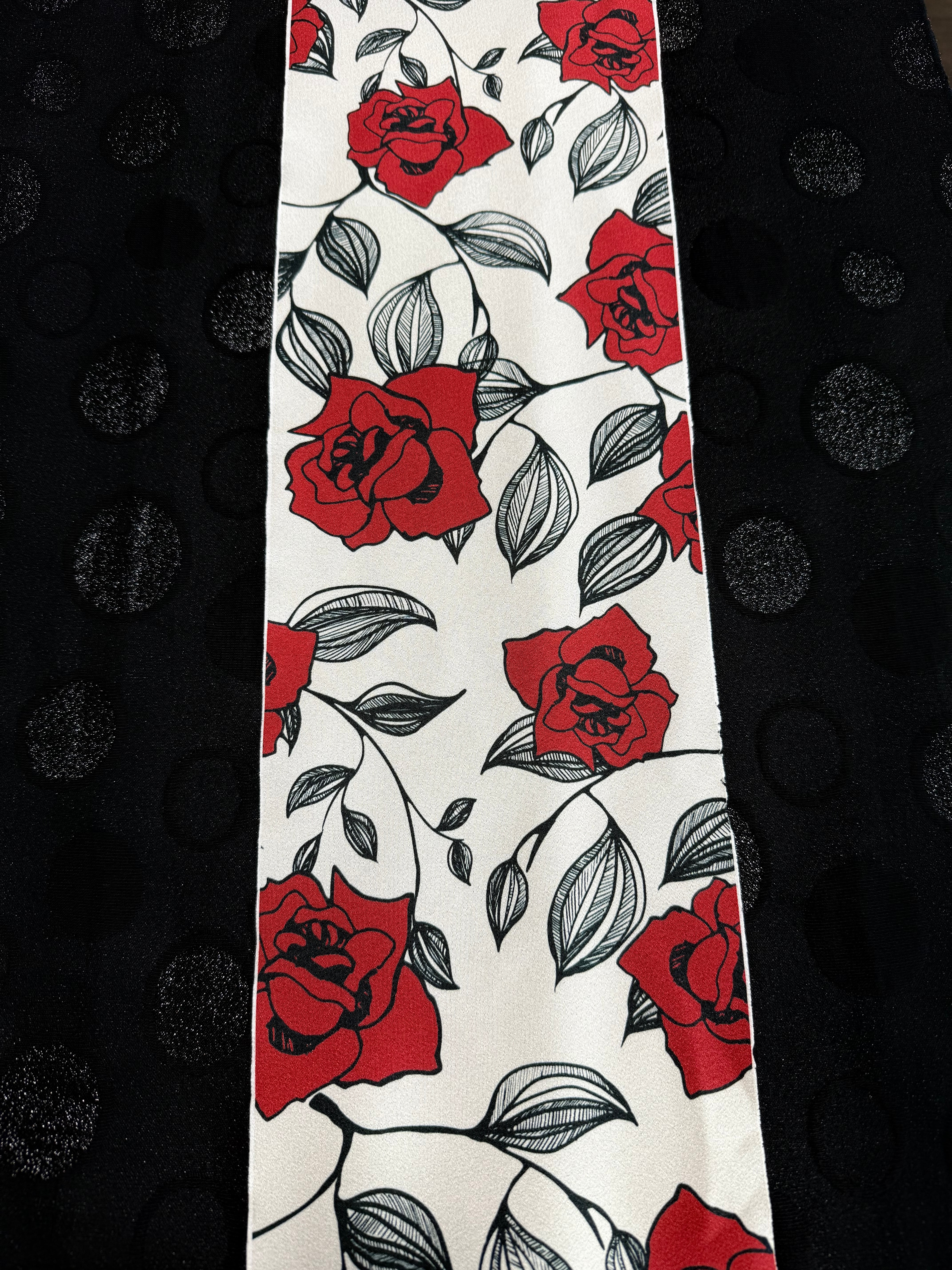 葉っぱのデザインは、さりげなく存在感を放ちつつ、大きめな薔薇がチラッと見えることで、華やかさを引き立てます。日常使いから特別なシーンまで、自由にコーディネートを楽しむことができるのが嬉しいポイントです。