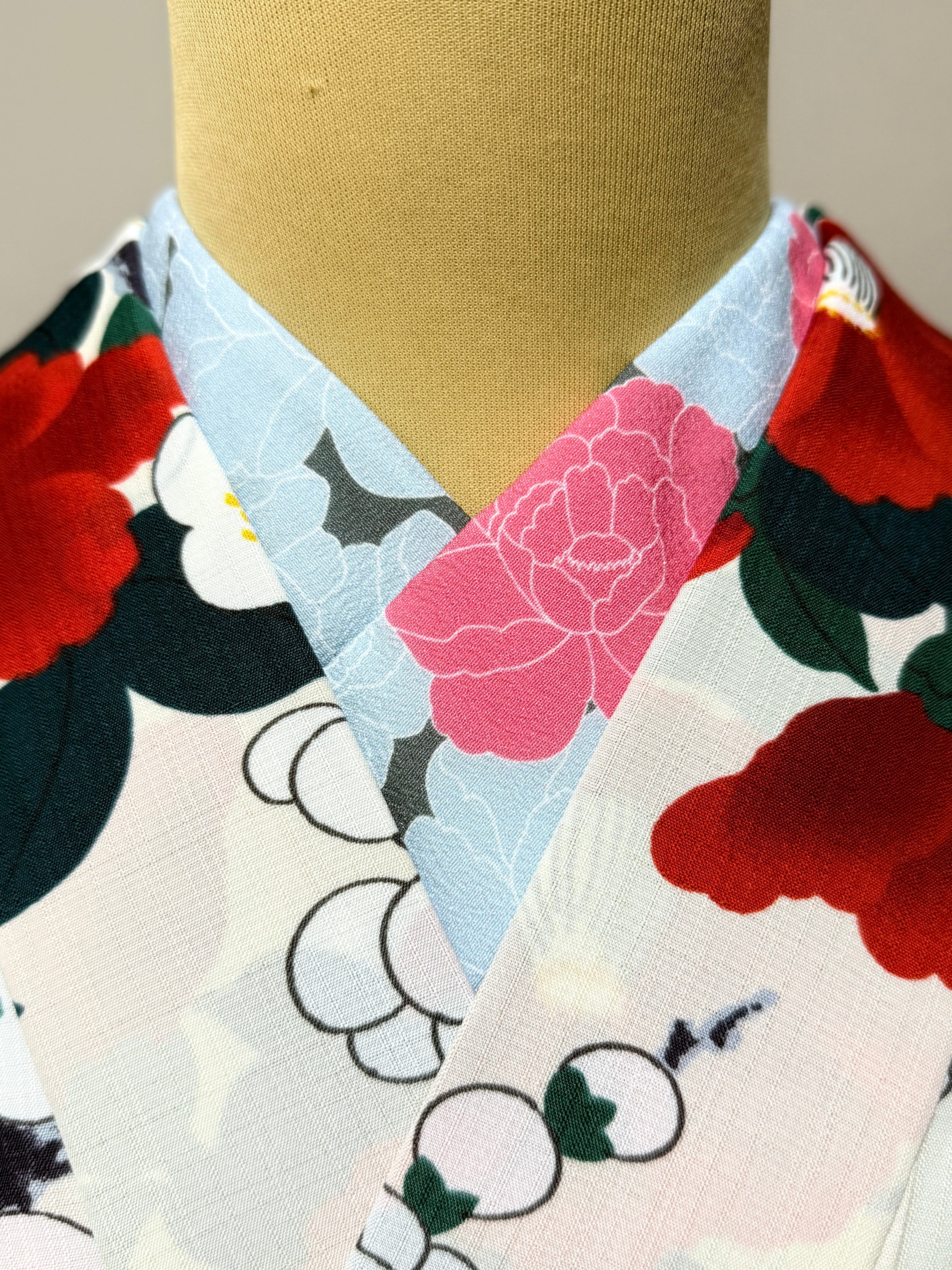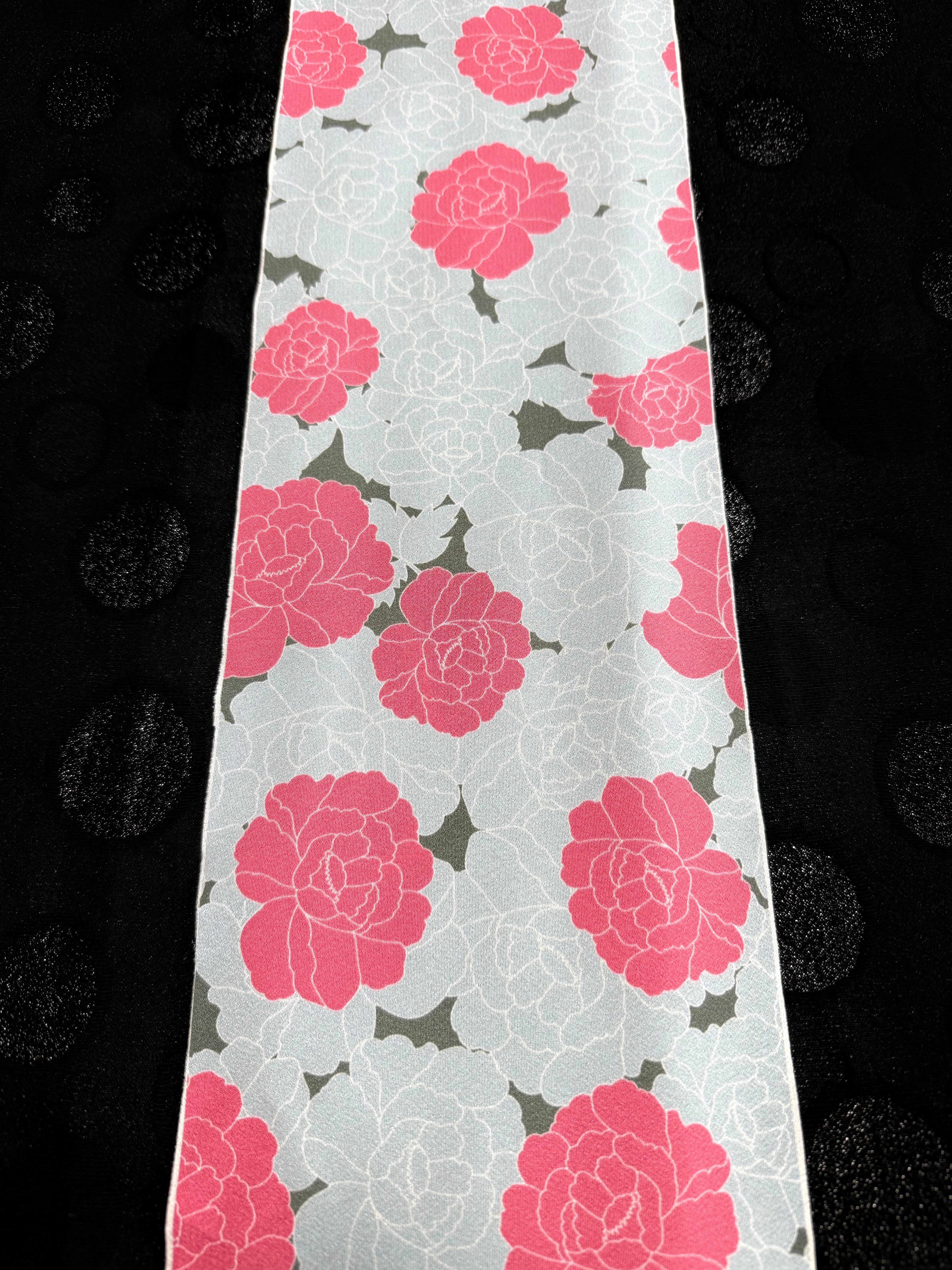 こちらの半衿は、大きめな濃いピンクとグレーの椿が華やかで可愛らしいデザインです。