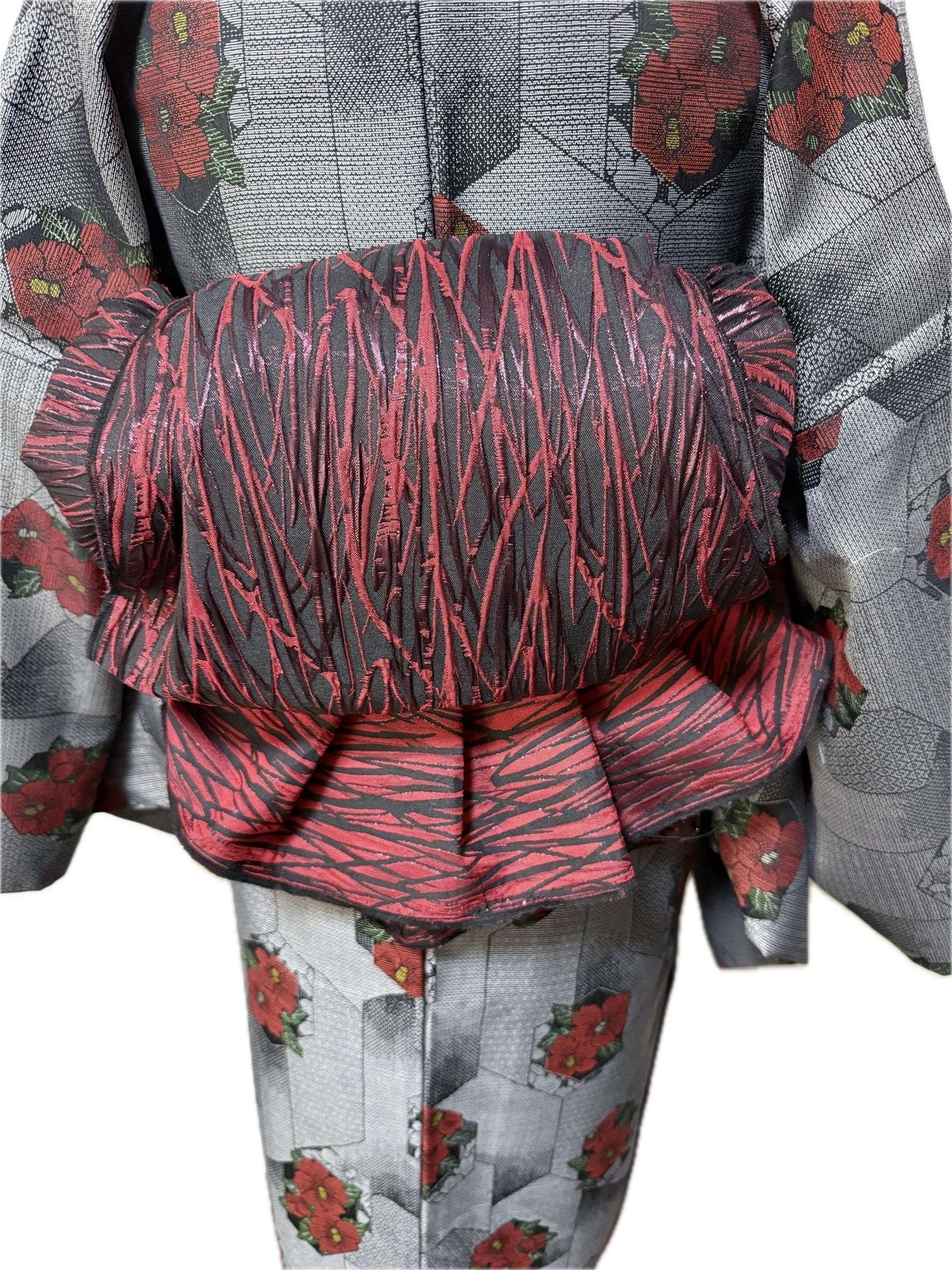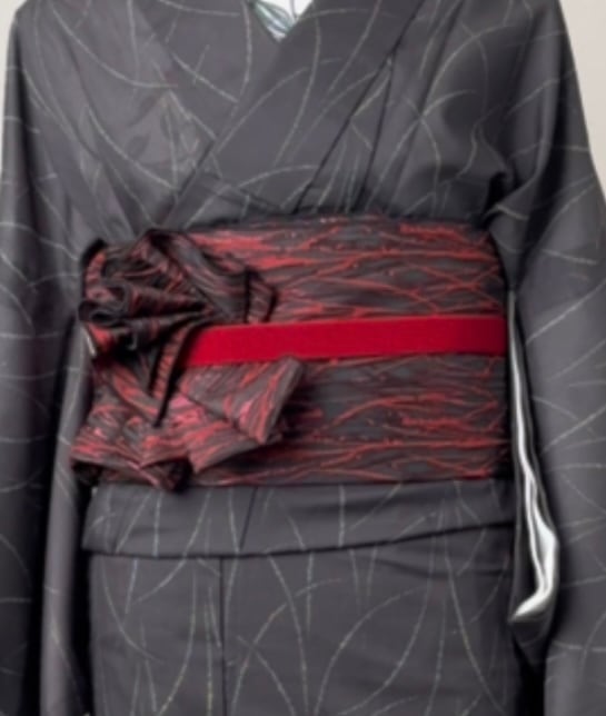 静かに揺らめく炎のように、深紅と漆黒が織りなす艶やかな兵児帯。