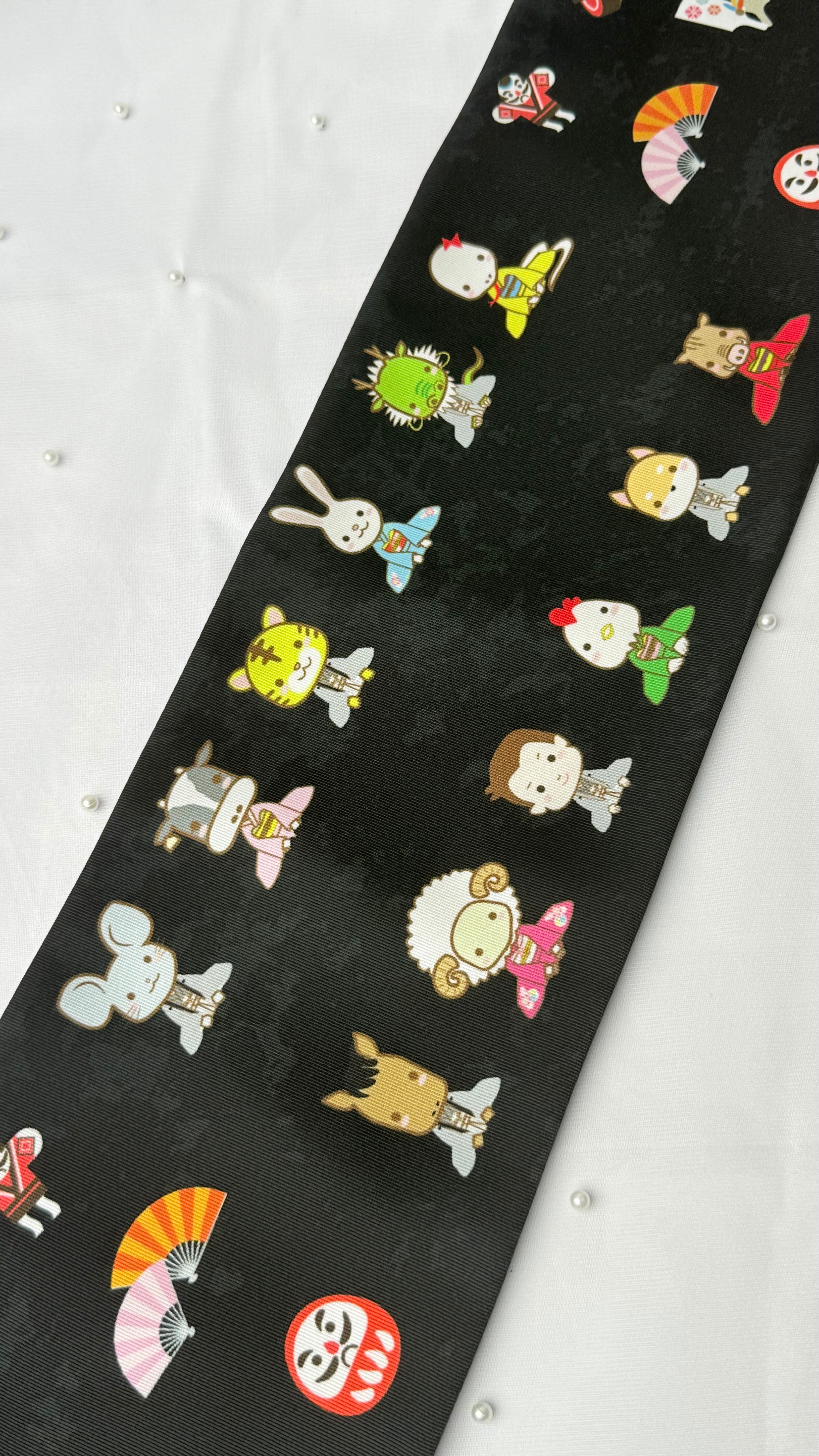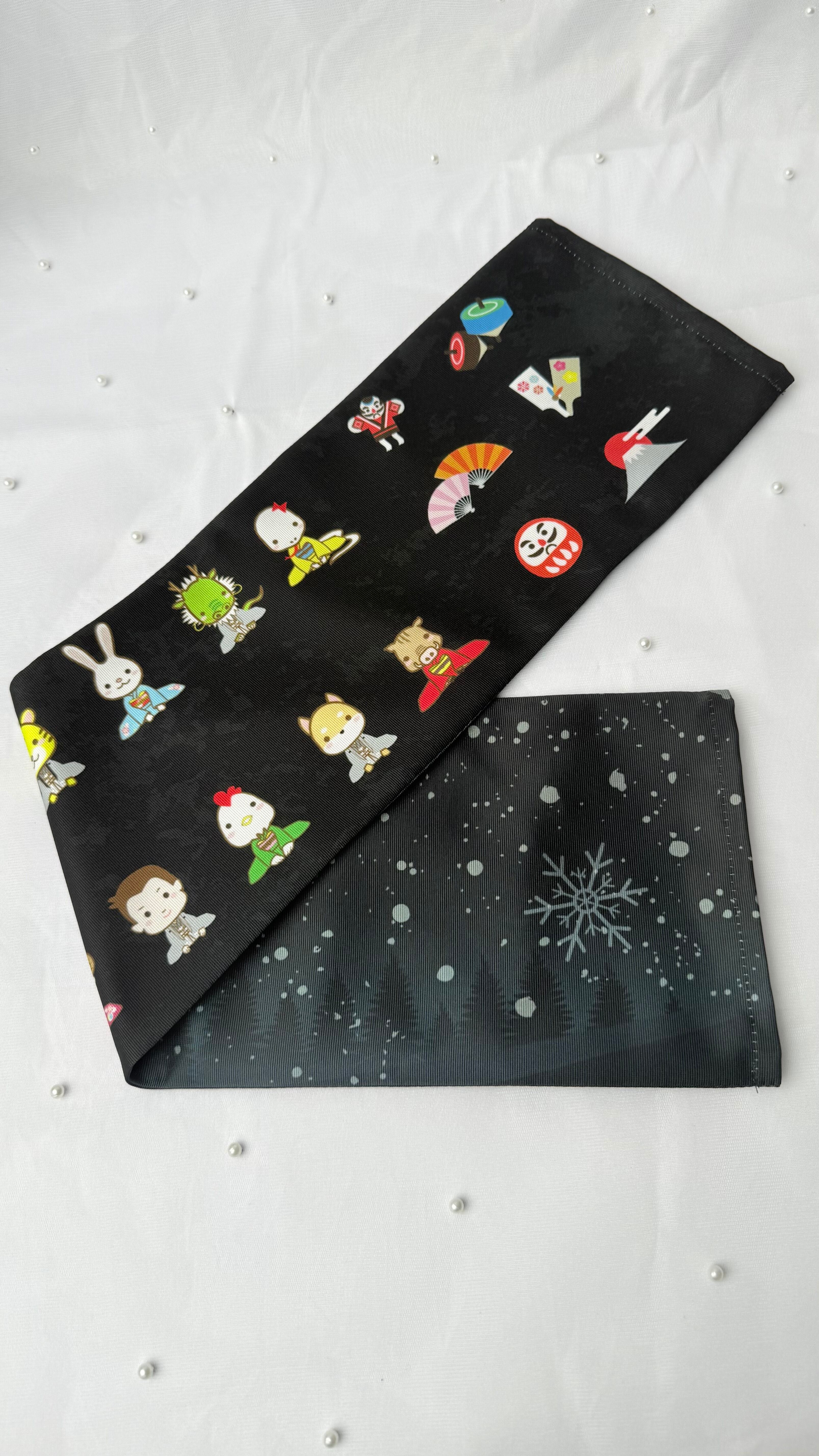 半幅帯、名古屋帯、兵児帯に通すだけで、胴前の雰囲気が一瞬で変わるのが魅力。サンタクロースが走り回る冬の夜空と、可愛い十二支が彩るデザインが、特別なイベントや普段のコーディネートにピッタリ!季節ごとの心温まるおもてなしを演出します。