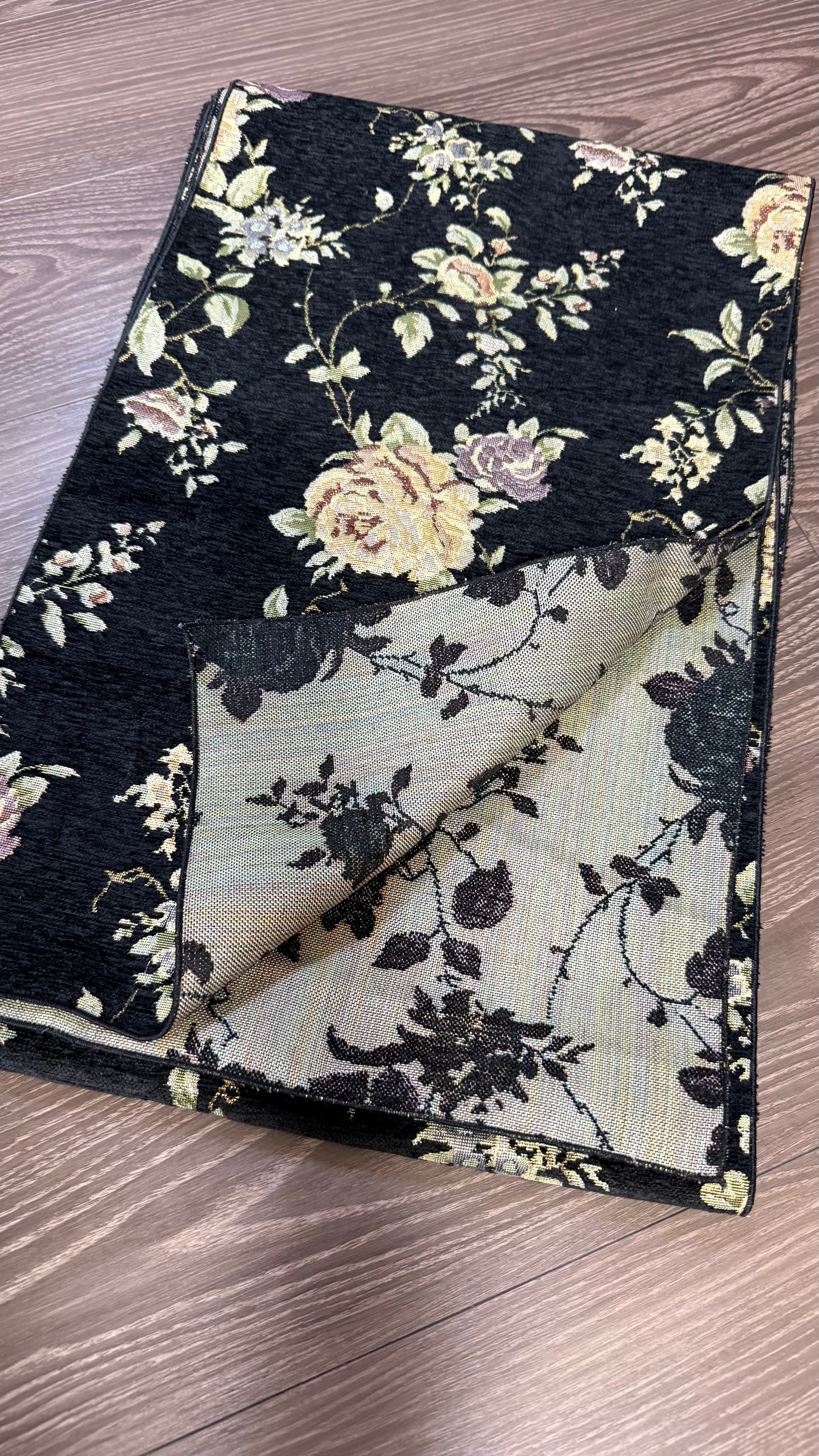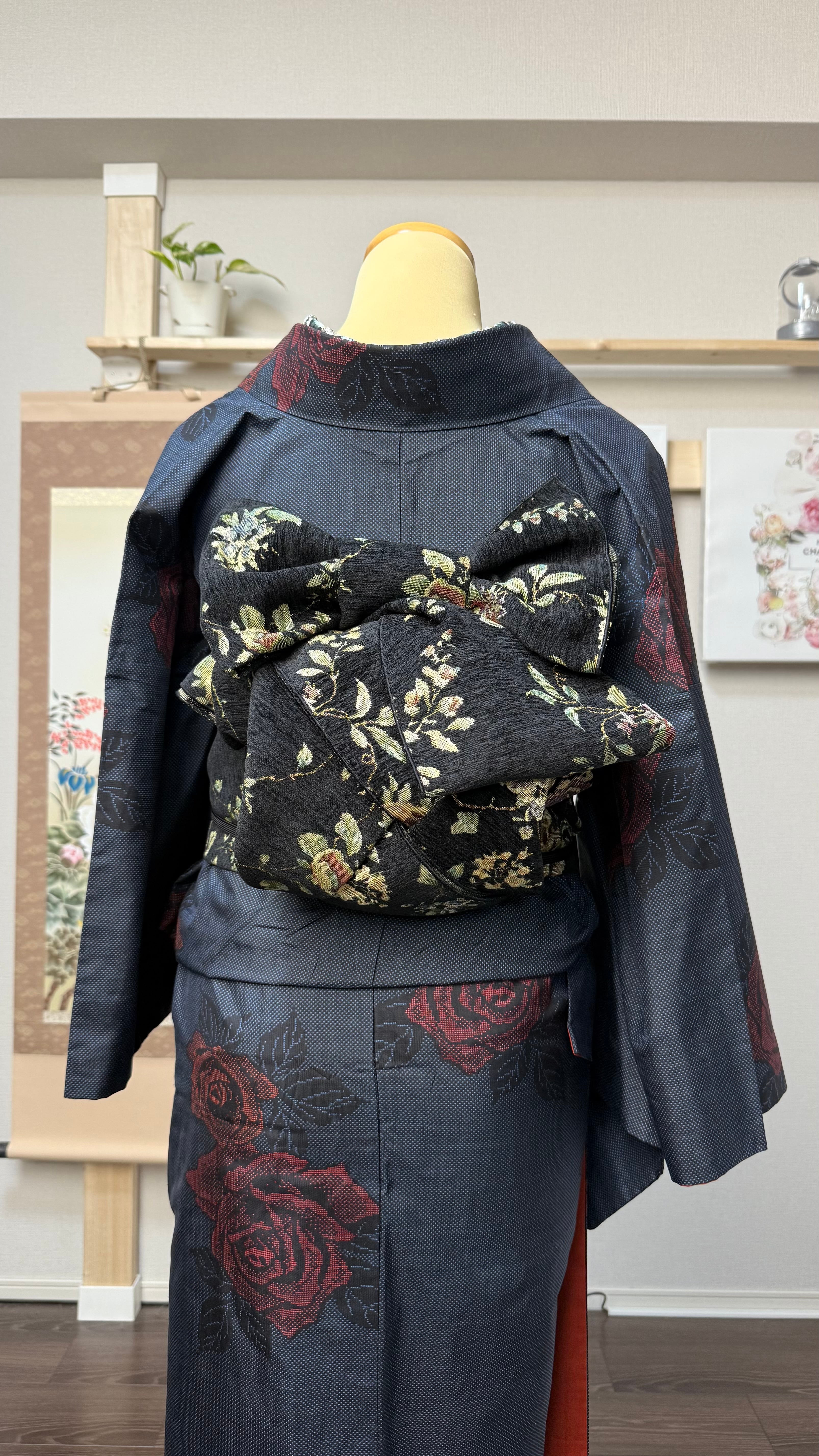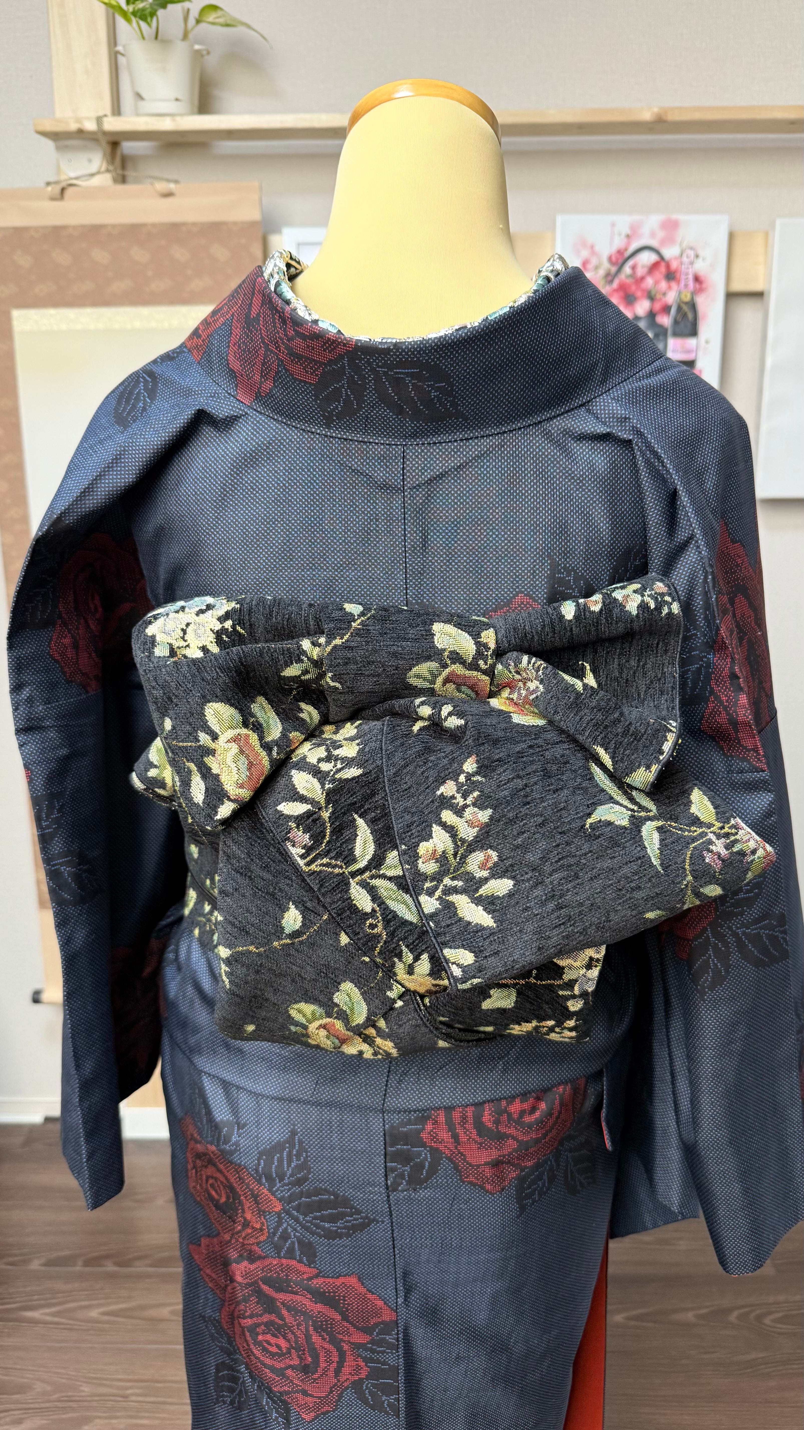 この兵児帯は、黒地に描かれたアンティークローズの柄が特徴で、秋冬の装いにぴったりの雅やかな雰囲気を演出します。幅32cm、長さ425cmと十分なサイズ感で、バリエーション豊かな帯結びを楽しむことができます。特別な日のお出かけや、日常のコーディネートにも華を添える一品として、お楽しみください。