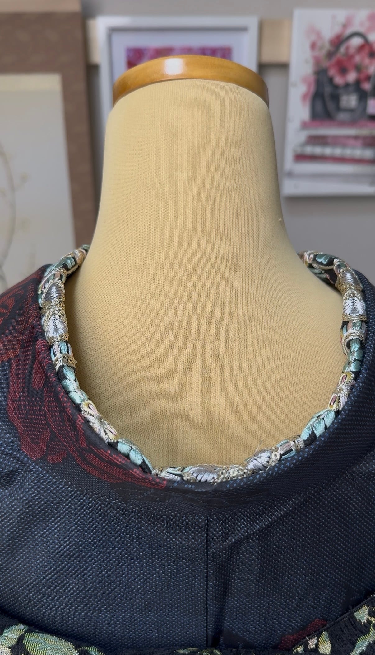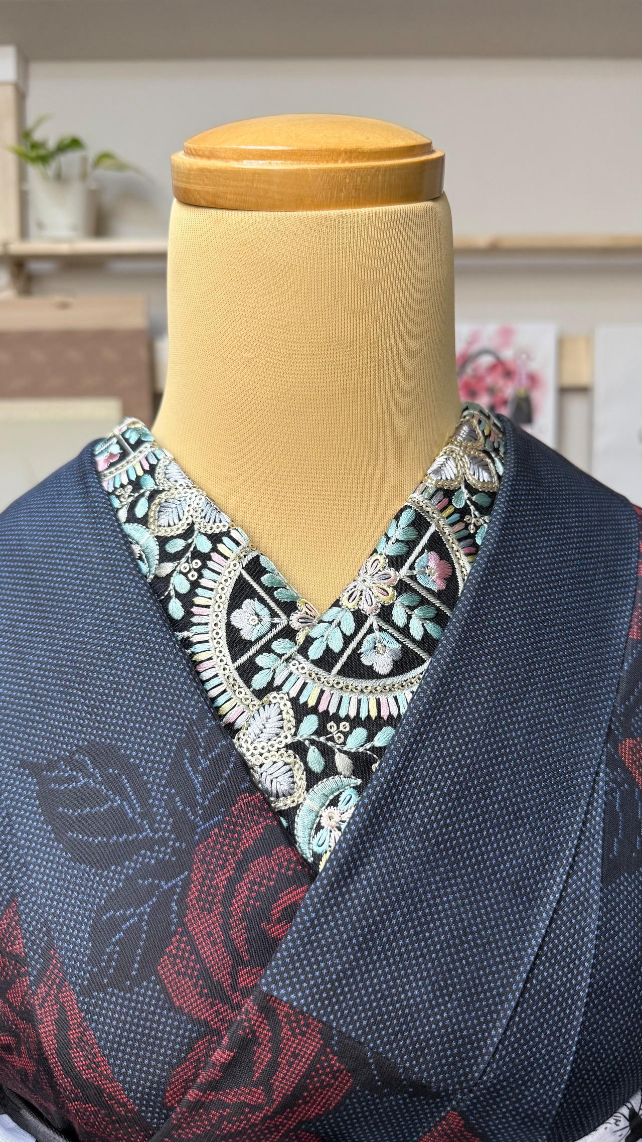 この半衿は、黒地にパステルカラーの刺繍が施された幅広のインド刺繍リボンが特徴です。鮮やかで華やかな円紋刺繍が、着物のコーディネートに瞬時に個性をプラスします。